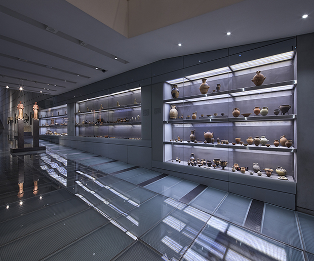 The gallery’s upward sloping floor reflects the nature of the path that someone in antiquity would have followed as they ascended the Acropolis Rock, while glass panels in the floor allow Museum visitors to enjoy a visual connection with the archaeological excavation exhibited just below.