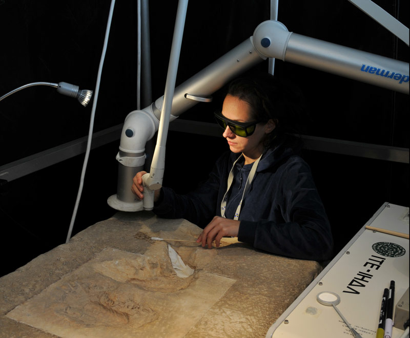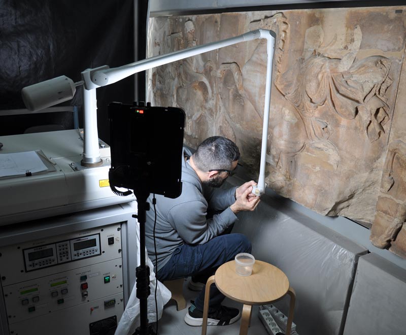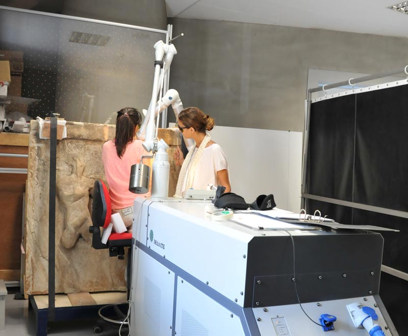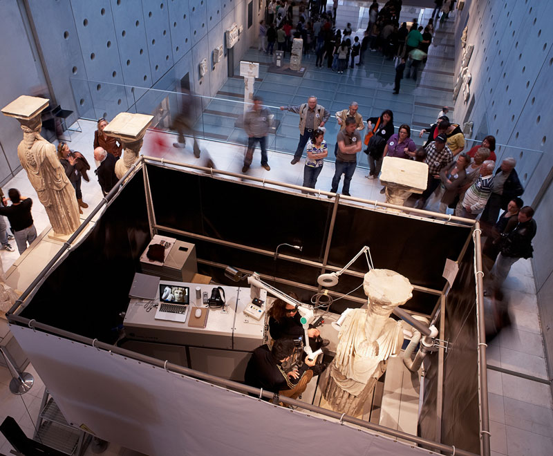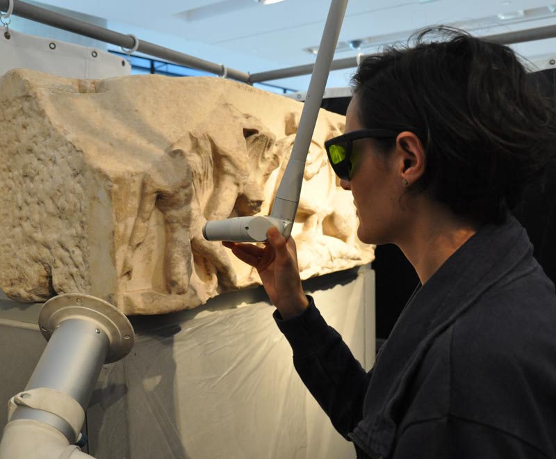 In June of 2021, the laser cleaning program of the Acropolis Museum sculptures from pollution encrustations was completed. In its 15-year duration, 70 sculptures and fragments were treated, mainly architectural sculptures from the Parthenon the Erechtheion and the temple of Athena Nike. The methodology used was the same employed for the cleaning of the Parthenon’s west frieze by the Acropolis Monuments Restoration Service (YSMA) in 2002-2005. A prototype laser cleaning system was developed by the Institute of Electronic Structure and Laser (IESL) of the Foundation of Research and Technology-Hellas (FORTH) in Crete, to cover the specific needs of the program. This is a specially modified Nd:YAG system, emitting at the fundamental (1064nm) and third harmonic (355nm) frequencies. The two beams are spatially and temporally overlapped while they can be used separately or in combination. The ability to adjust the proportions between the two actions allows the safe removal of the surface deposits, without altering the ancient surfaces. In 2012, the International Institute for Conservation (IIC) awarded the Acropolis Museum and the IESL-FORTH of Crete with the Keck Award for providing visitors the opportunity to observe the conservation and the cleaning process of the Karyatids.